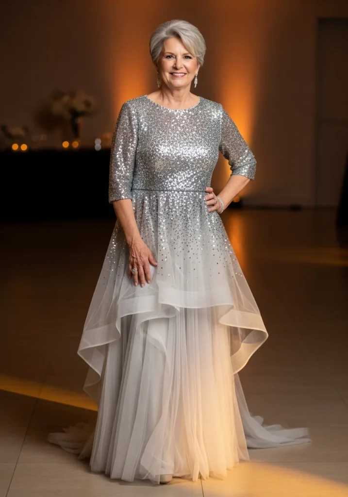 This design features a mature woman in a sleek silver sequin column gown with three quarter sleeves, a modest neckline, and a softly structured fit that skims the body beautifully in a softly lit indoor setting.