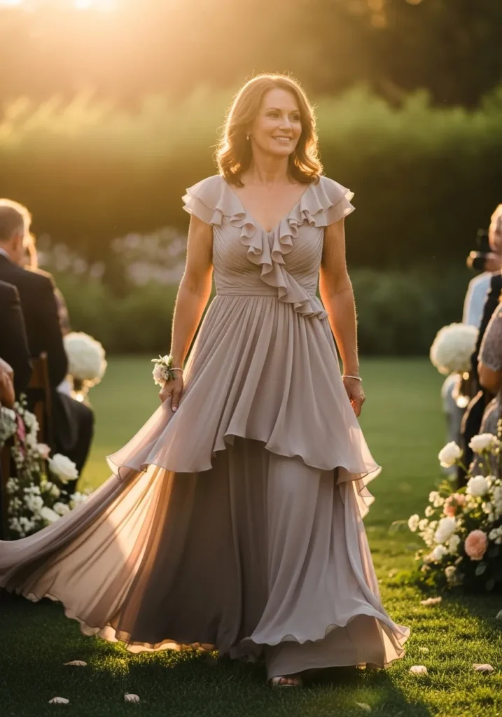 This design features a mature woman in a taupe chiffon gown with delicate ruffle details, soft pleating, and a flowing skirt that catches the light beautifully in a sunlit garden ceremony setting.