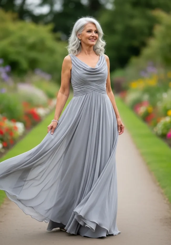 This look showcases a mature woman in a flowing silver gray chiffon gown with gentle draping, a softly cinched waist, and elegant movement as she walks through a lush garden path.