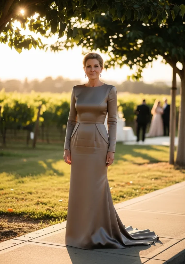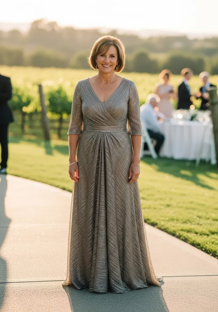 This design features an older woman in a metallic taupe gown with soft draping, a fitted bodice, and a flowing skirt, styled beautifully in a vineyard reception setting.