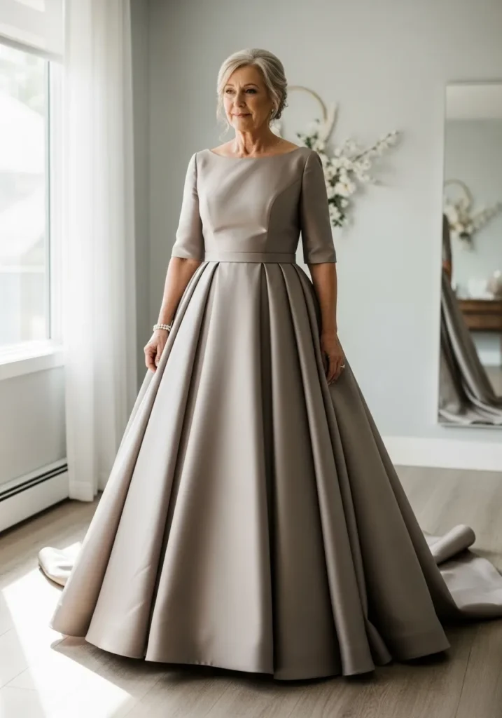 This gown shows a mature woman wearing a structured taupe mikado ballgown with a fitted bodice, full pleated skirt, and a clean, architectural silhouette, styled in bright natural window light.