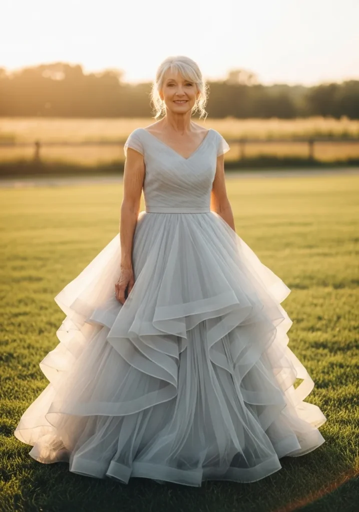 This gown shows an older woman wearing a dreamy silver tulle ballgown with a softly fitted bodice and cascading layers of airy fabric that create beautiful volume and movement in an open countryside setting.