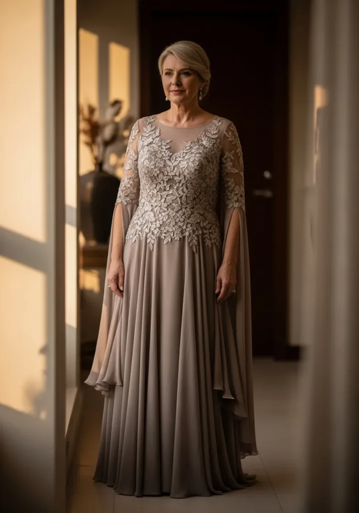 This dress features a mature woman in a taupe pleated gown with delicate beadwork, long sheer sleeves, and a softly flowing skirt that creates a beautiful vintage inspired silhouette indoors.