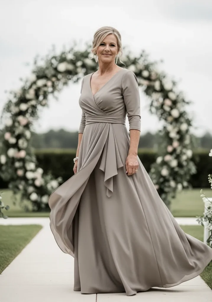This design features a mature woman in a taupe wrap style gown with soft pleats, a gently cinched waist, and a flowing skirt that moves beautifully down the aisle beneath a floral ceremony arch.