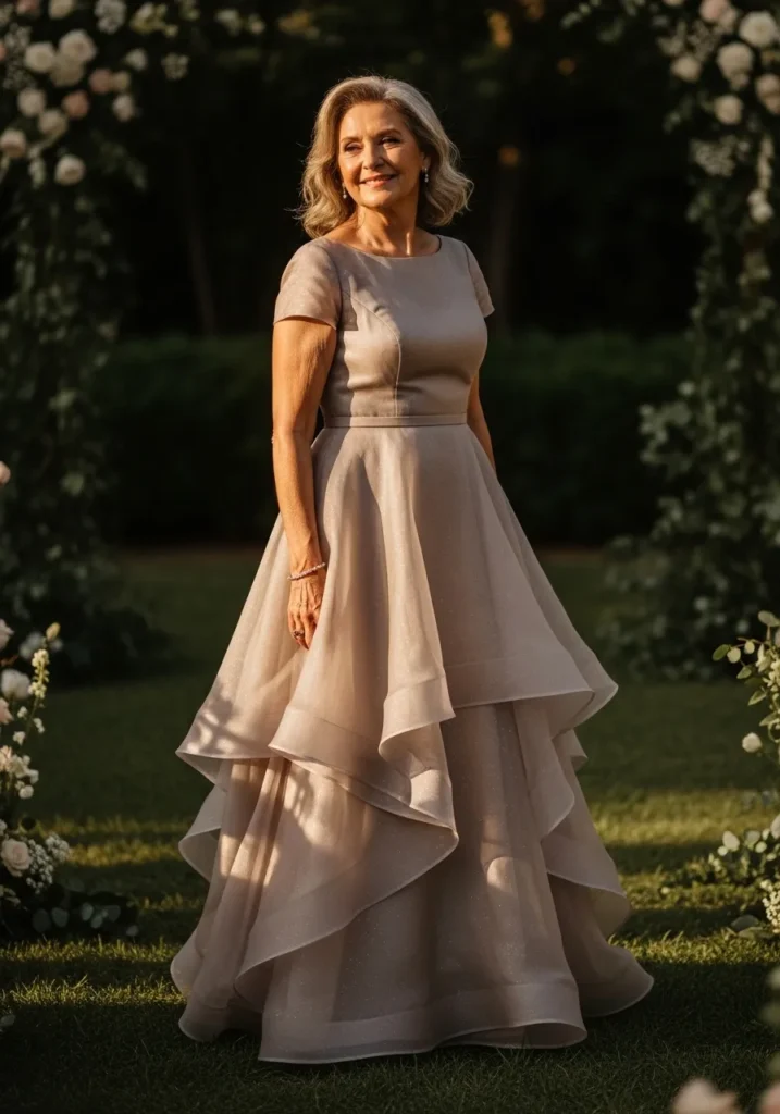 This gown highlights an older woman wearing a taupe chiffon dress with tiered layers, delicate sleeves, and a soft flowing skirt set against a garden backdrop filled with warm sunlight.
