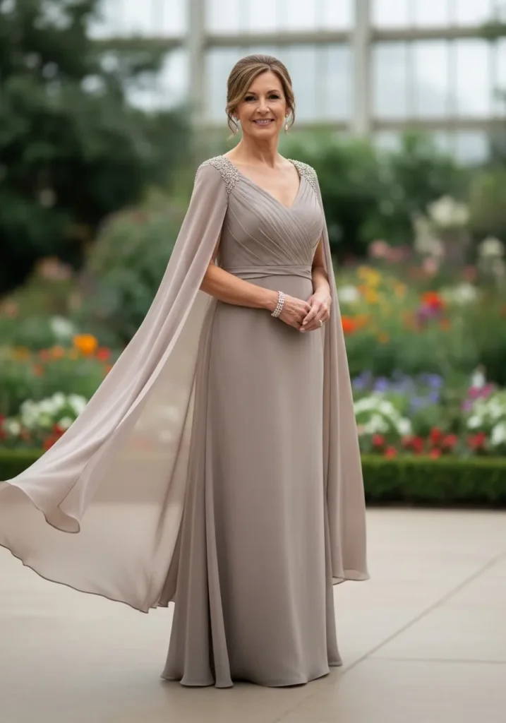 This look features a mature woman wearing a soft taupe gown with a flowing cape overlay, a relaxed silhouette, and graceful movement, styled beautifully against a scenic vineyard backdrop.