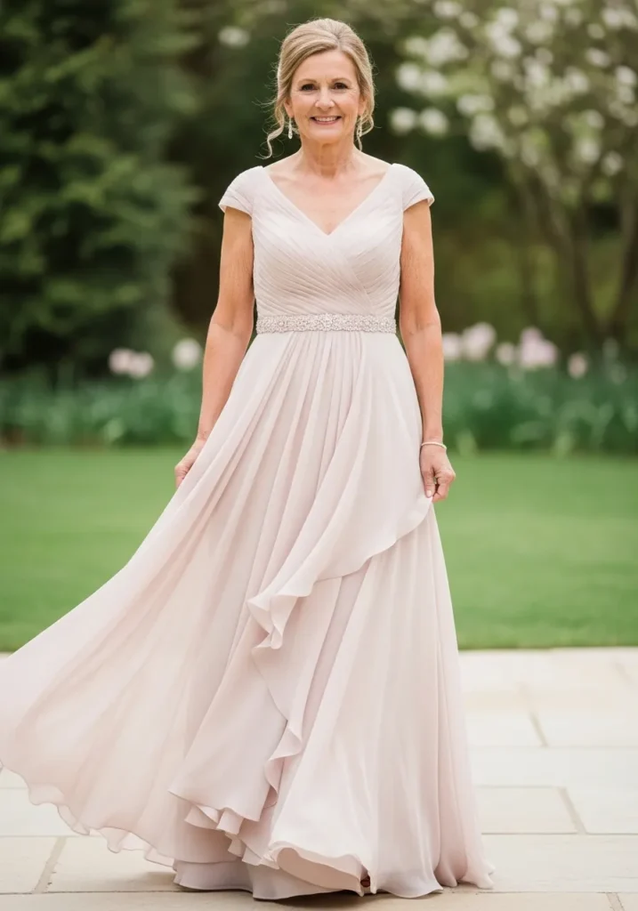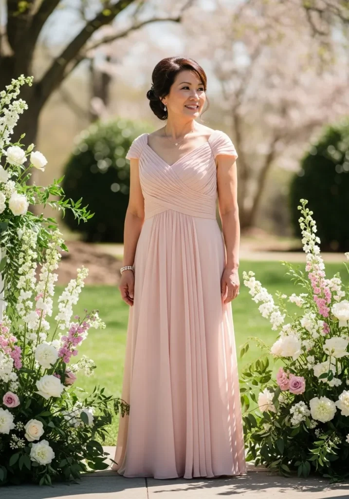 This look features a soft blush chiffon gown with a wrap-style bodice, flutter sleeves, and a flowing skirt that moves beautifully with every step, creating a light and airy silhouette that feels perfect for a spring celebration.