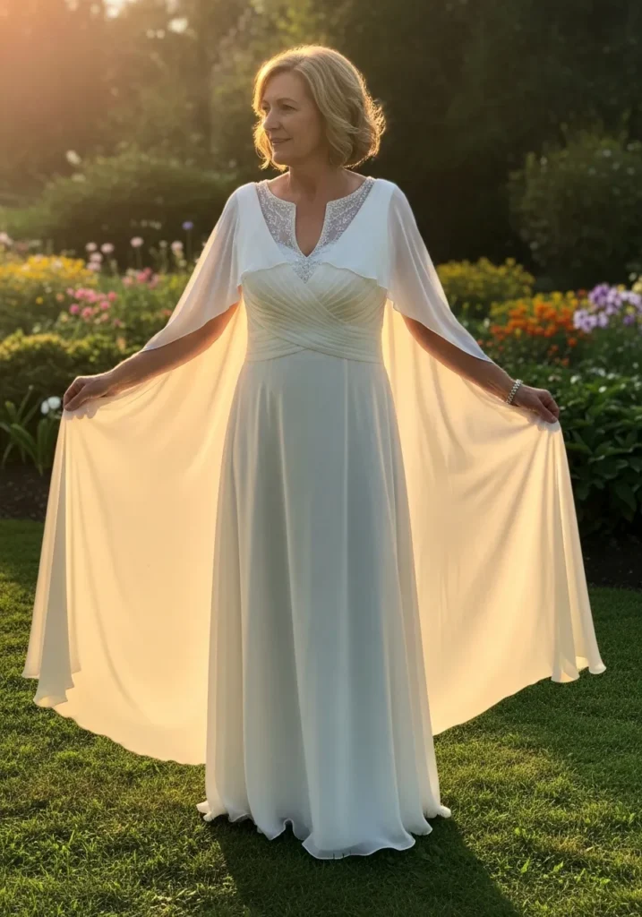 This ivory chiffon dress features a softly draped bodice, elegant cape-style sleeves, and a fluid skirt that creates graceful movement as she stands on a sunlit terrace, giving the entire look a light and airy presence.