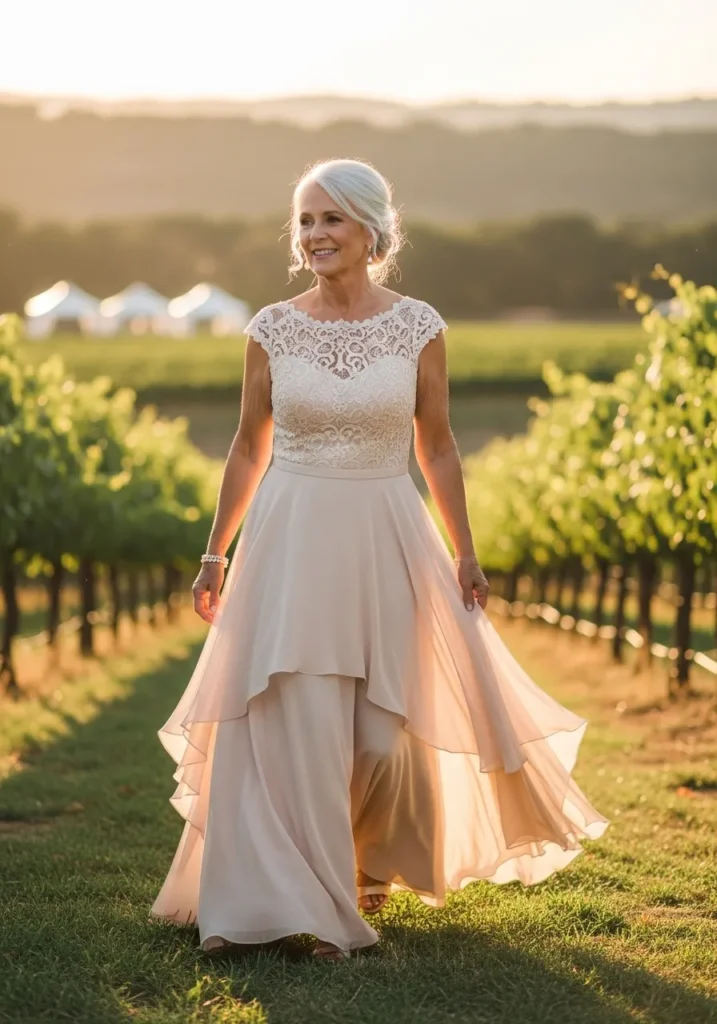 This champagne chiffon gown showcases a lace detailed bodice, soft layered skirt, and flowing chiffon that moves beautifully against the vineyard backdrop.