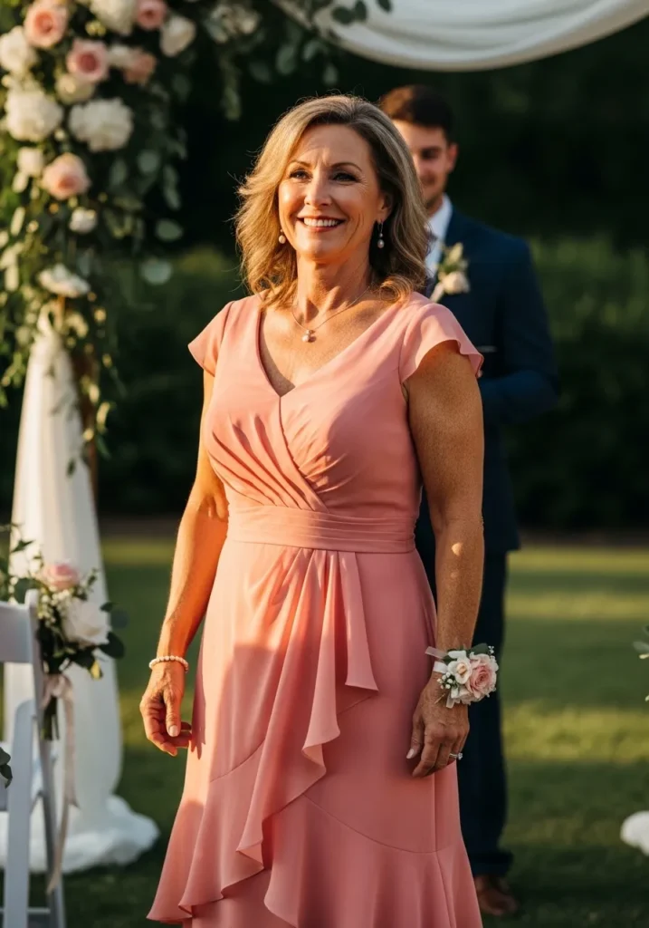 This coral chiffon gown features a ruched bodice, cap sleeves, and a flowing skirt that moves gently as she walks through a floral ceremony setting.