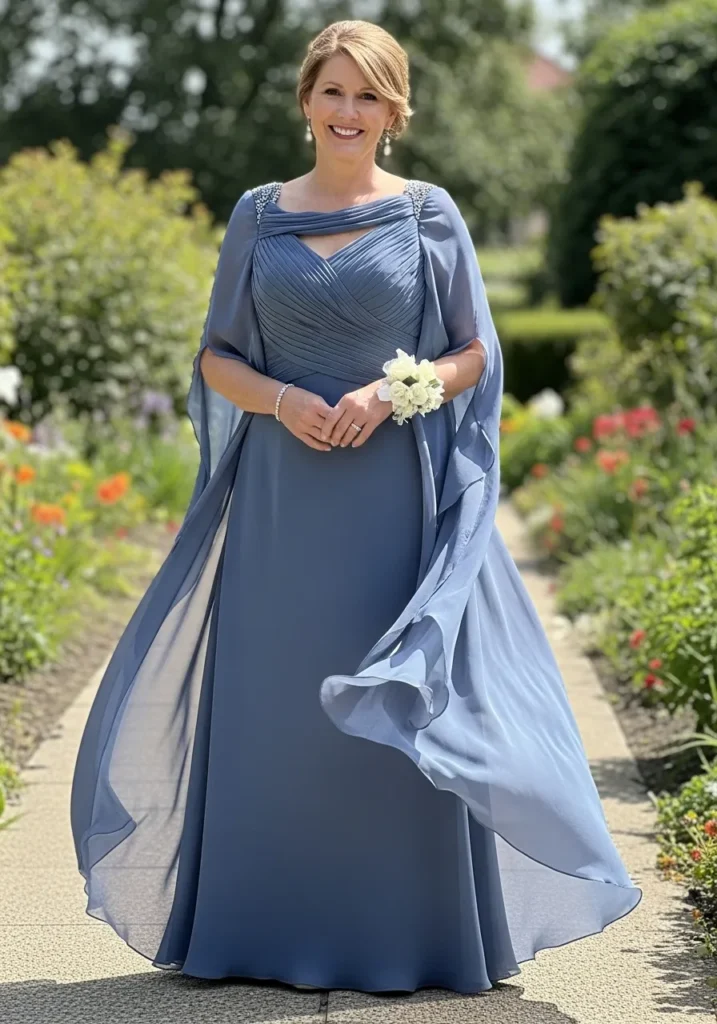 I think this shade of blue is incredibly flattering and serene, and the overall flow of the fabric makes it feel polished yet easygoing, which is exactly what I look for in a mother of the bride dress.