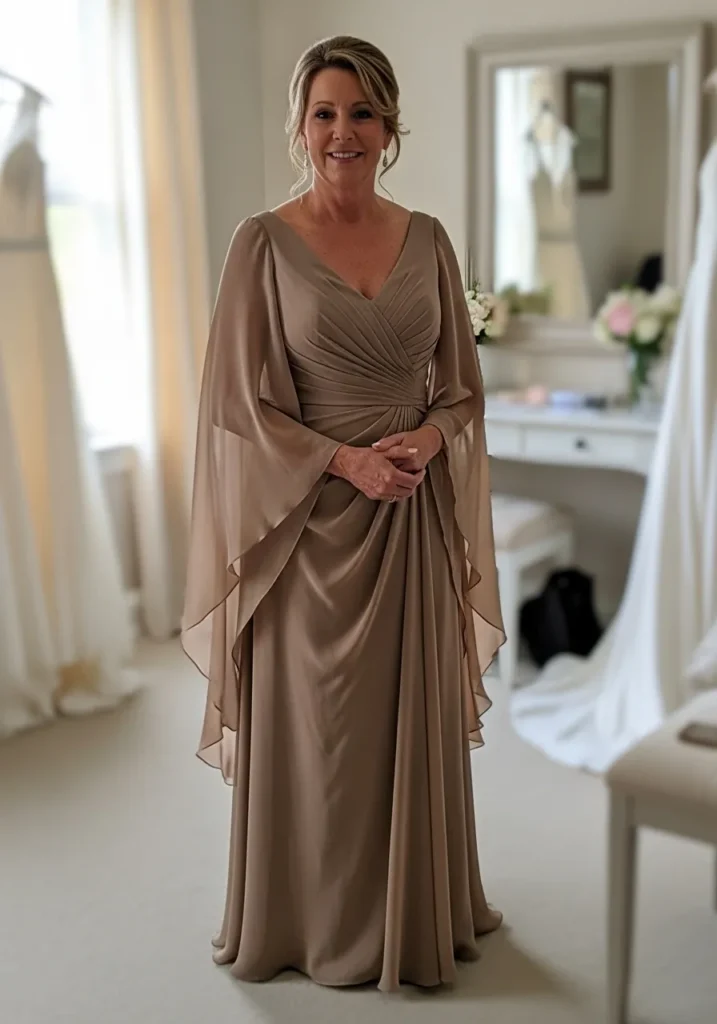 This taupe chiffon gown features a softly wrapped bodice, flowing sheer sleeves, and a fluid skirt that creates gentle movement inside a bright bridal suite.