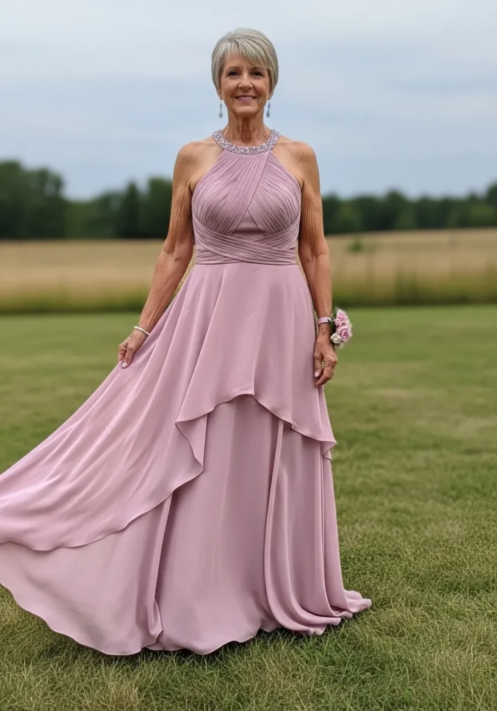 This mauve chiffon gown showcases a halter neckline, tiered skirt layers, and flowing fabric that moves beautifully across an open countryside setting.