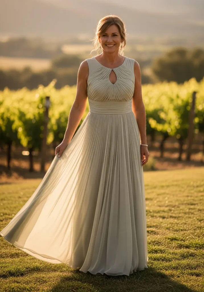 This champagne chiffon gown showcases a delicately textured bodice, sleeveless cut, and a gently flowing skirt that moves beautifully against a warm vineyard backdrop.