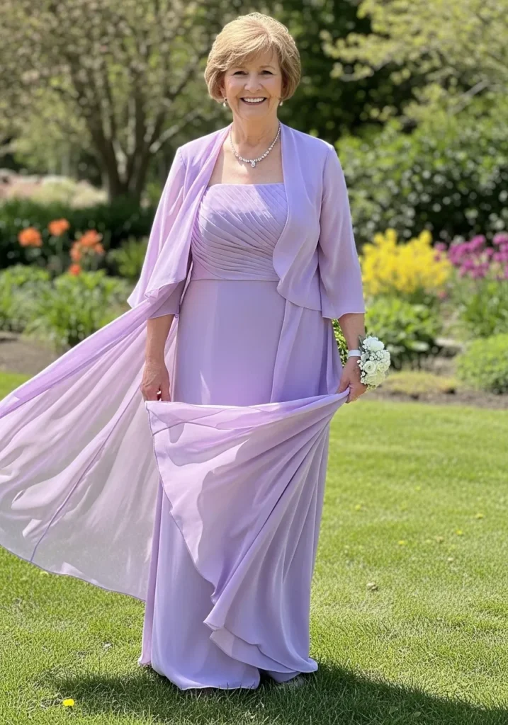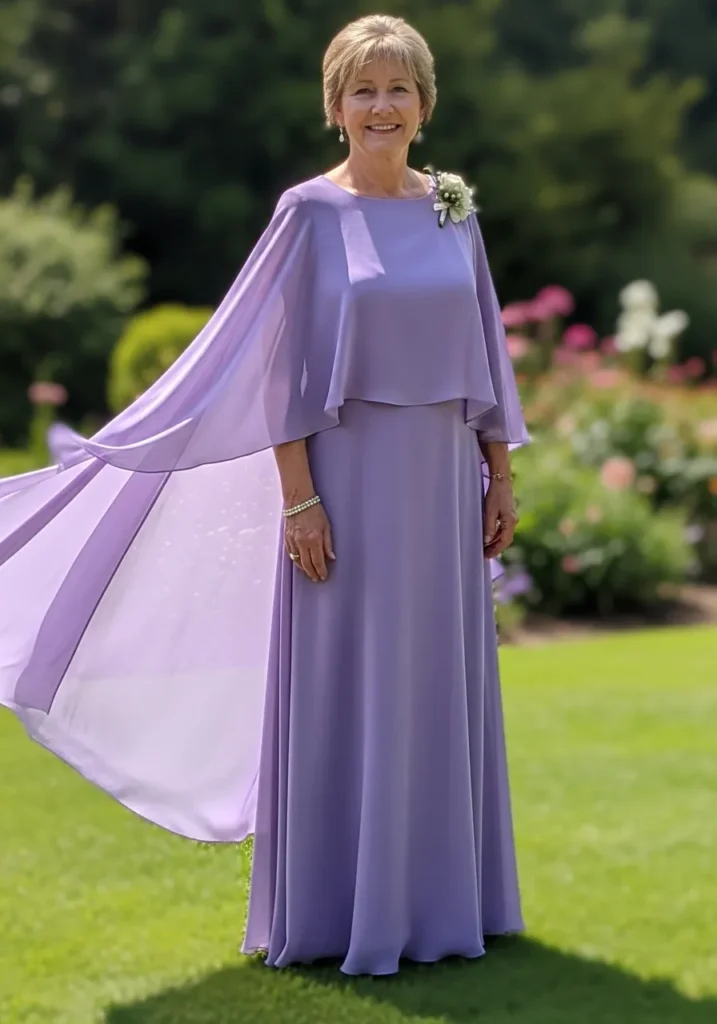 This lavender chiffon dress stands out with its flowing cape-style overlay, soft draping, and elegant straight silhouette that creates beautiful movement and a soft romantic finish.