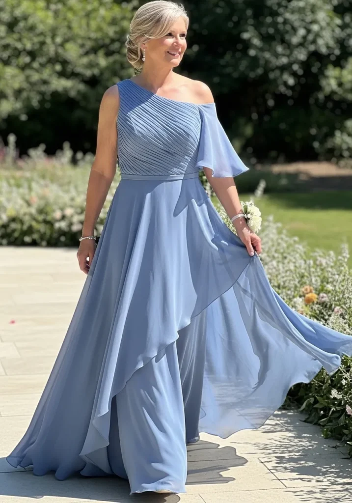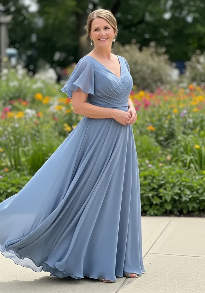 This dusty blue chiffon gown showcases a softly pleated bodice, relaxed flutter sleeves, and a long flowing skirt that creates graceful movement and a calm, airy presence.