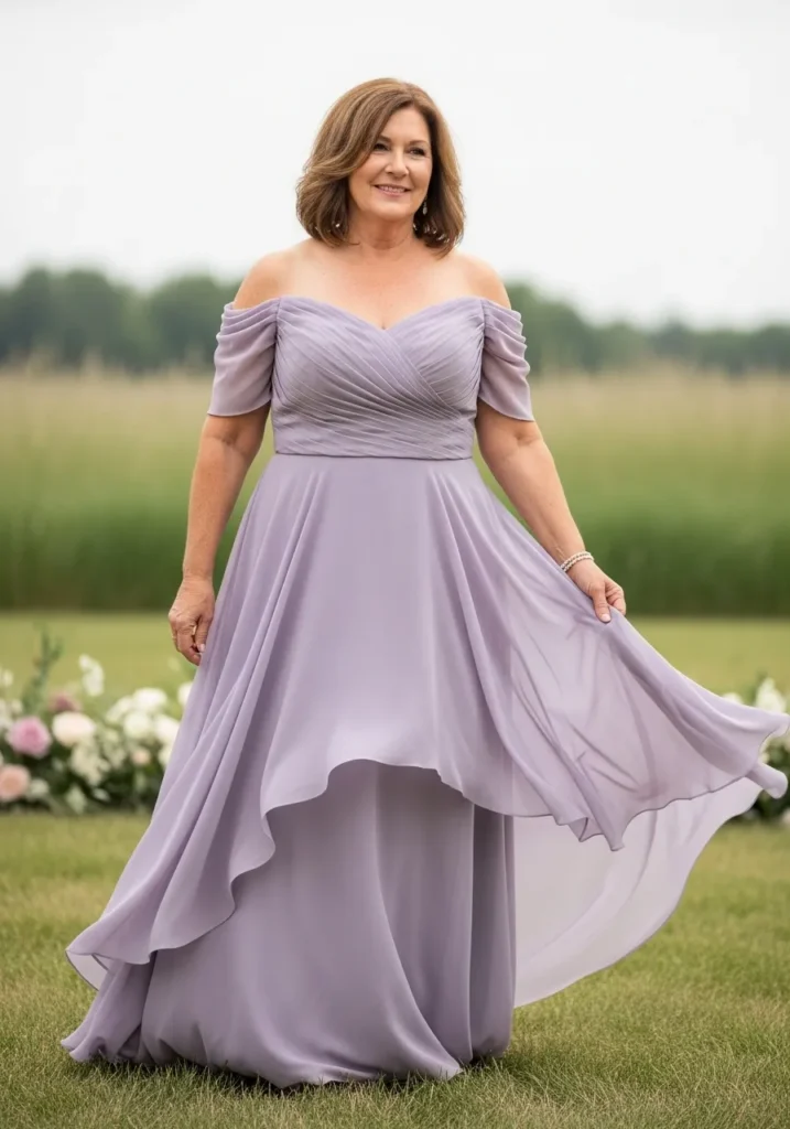 This soft lilac chiffon dress features an off the shoulder neckline, gently pleated bodice, and a layered skirt that moves beautifully with every step, creating a dreamy and graceful silhouette against the open garden backdrop.