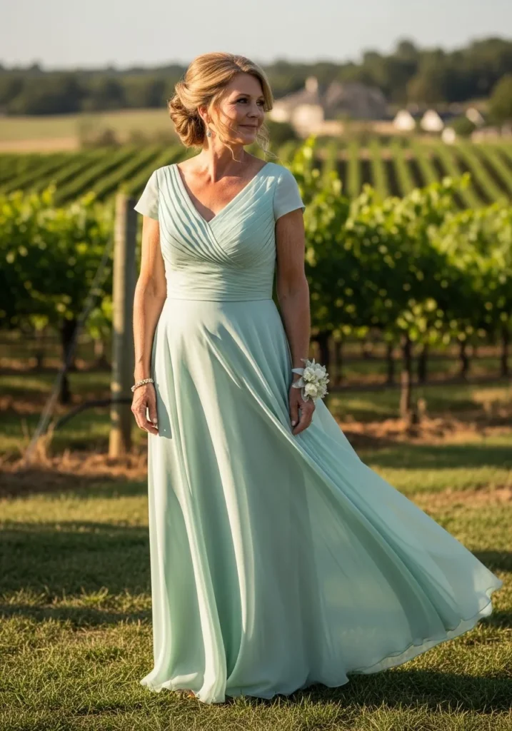 This soft mint chiffon gown features a V-neckline, flutter sleeves, and a flowing skirt that moves delicately with every step, creating a light and refreshing spring-ready look.