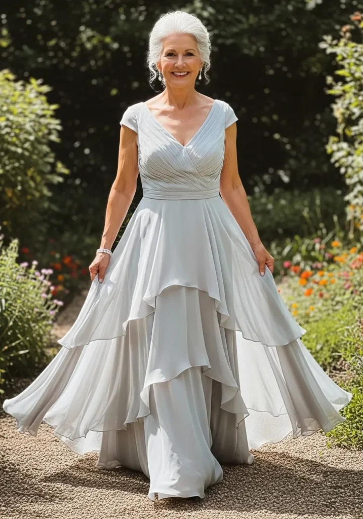 This light gray chiffon dress showcases tiered layers, soft draping, and a beautifully flowing skirt that creates depth, texture, and elegant motion.