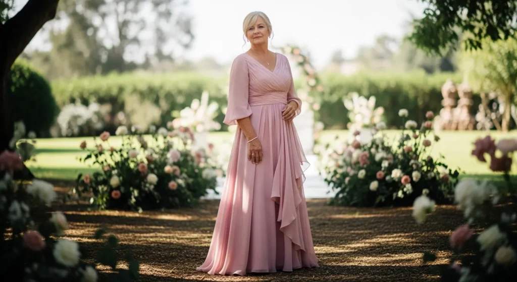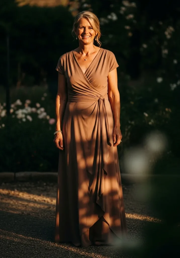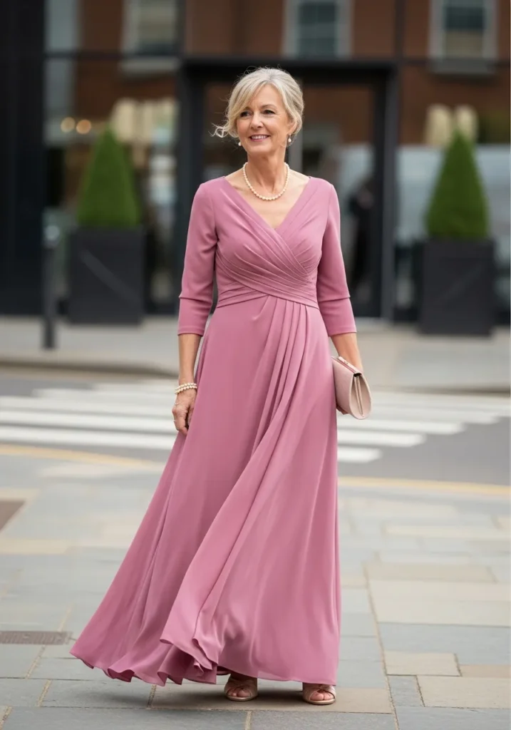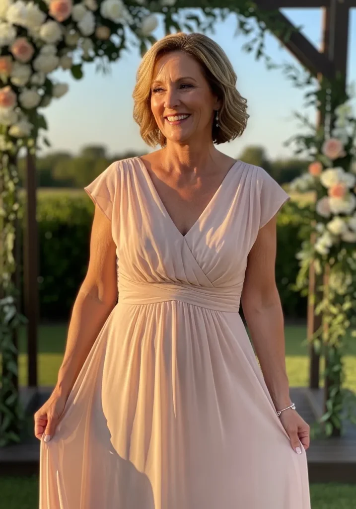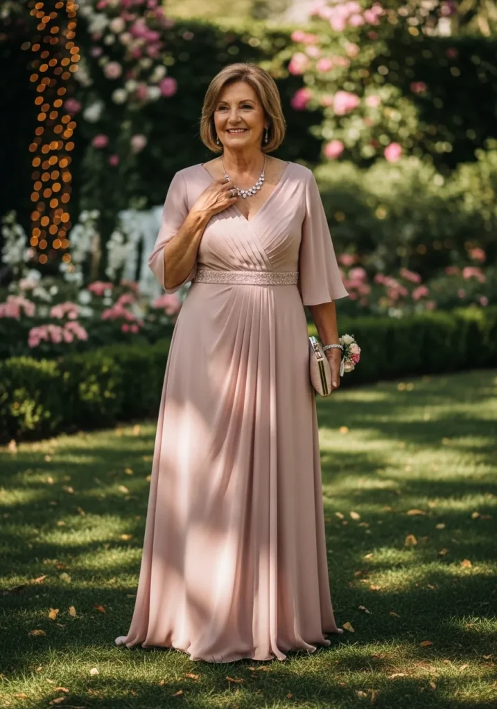 I love how soft and graceful this look feels. The wrap style offers comfort and flexibility, while the blush tone adds a flattering glow. It strikes the perfect balance between comfort and polish, which makes it such a beautiful choice for a mother of the bride.