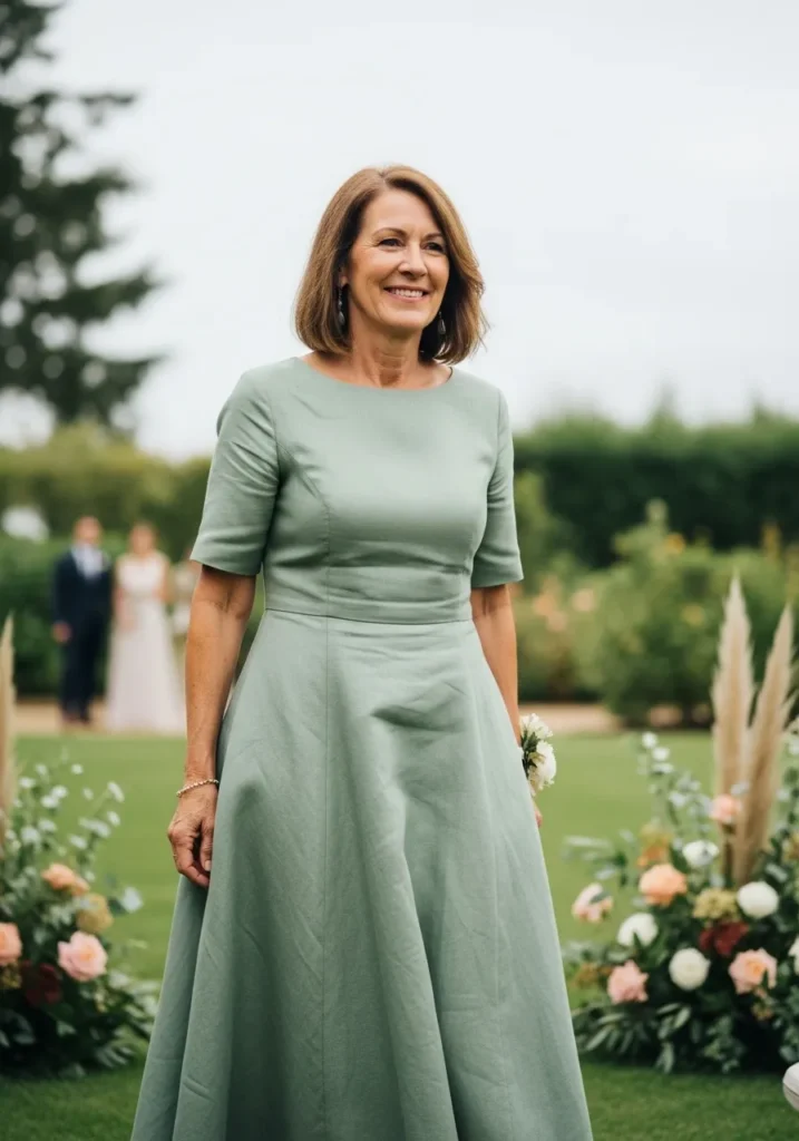 I love how effortlessly chic this dress feels. The sage green shade is fresh and calming, and the midi length makes it practical yet elegant. It feels perfect for mothers of the bride who love a modern style that still feels timeless and comfortable.