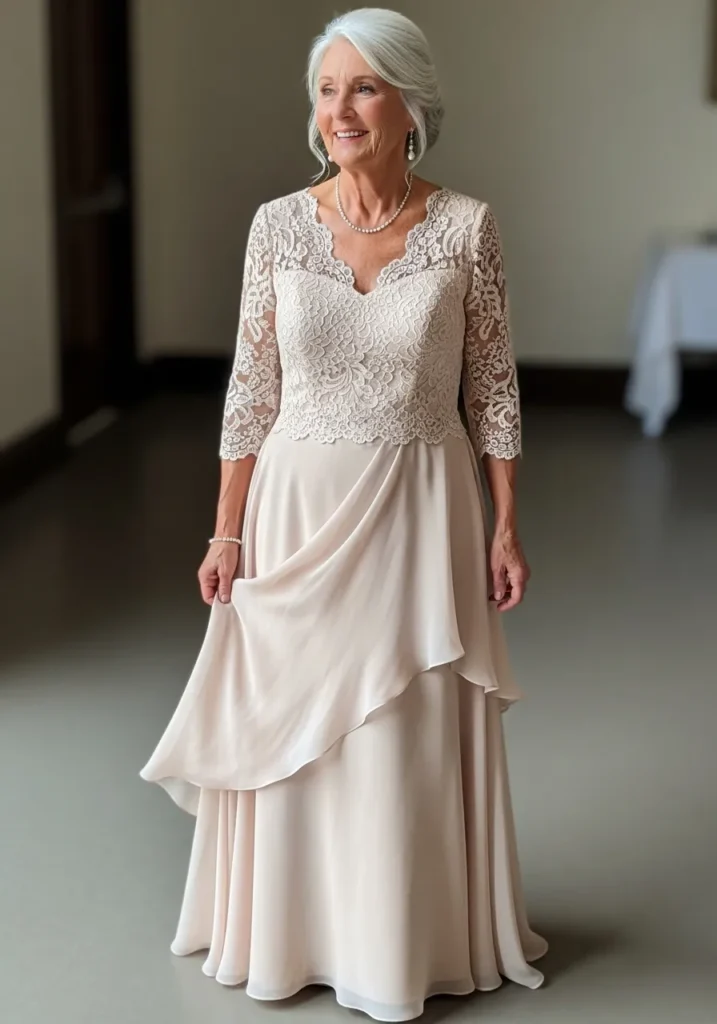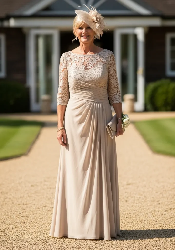 I adore how classic and refined this look feels. The lace detailing makes it elegant without feeling heavy, and the soft champagne tone is endlessly flattering. It is a perfect choice for mothers of the bride who want something traditional, graceful, and wonderfully comfortable all at once.