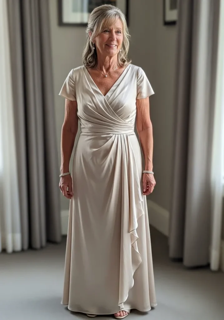 This soft champagne gown features a flattering wrap bodice, short flutter sleeves, and a flowing skirt that drapes effortlessly. The smooth fabric and clean lines create a refined yet relaxed look, enhanced by gentle natural window light.