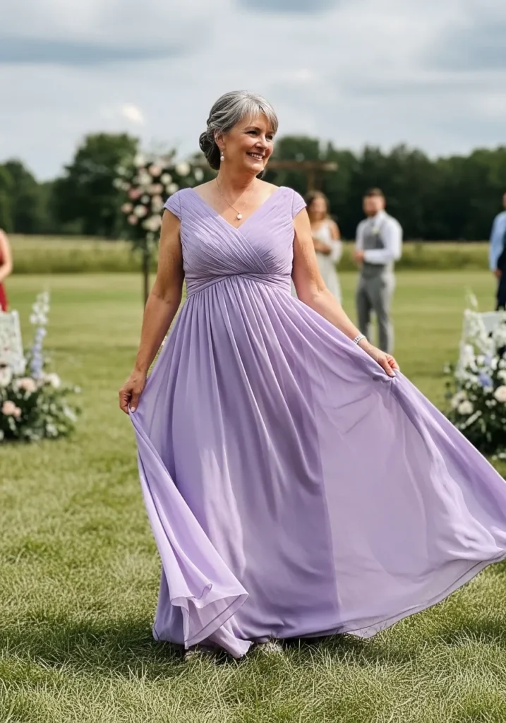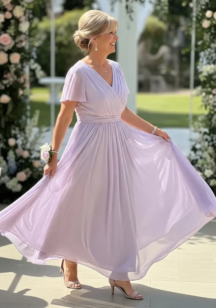 This flowing lavender chiffon gown features delicate pleating, a relaxed silhouette, and lightweight fabric that moves beautifully with every step. The soft V neckline and airy skirt create a flattering shape while keeping the look comfortable and breathable. The elegant outdoor setting adds to the romantic spring wedding atmosphere and highlights the gentle movement of the dress.