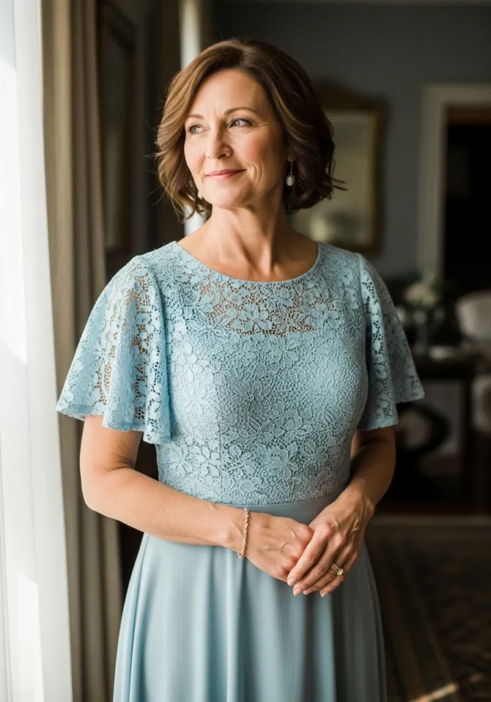 This soft teal gown features a delicate lace bodice, short flutter sleeves, and a gently flowing skirt that drapes beautifully. The lace texture adds a polished touch, while the smooth fabric keeps the overall look light and breathable. Soft indoor lighting highlights the intricate detailing and creates a calm, elegant atmosphere.