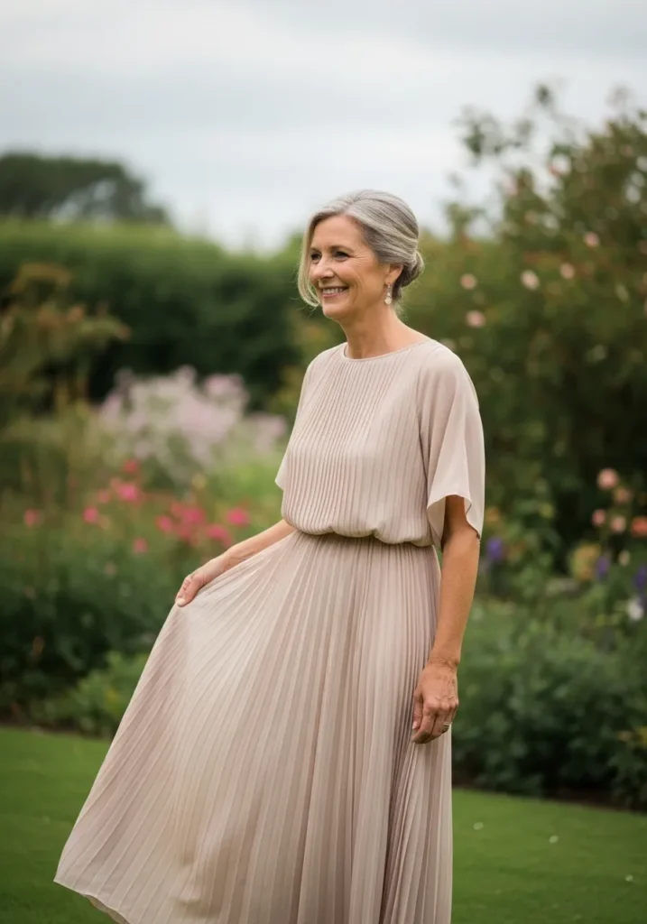 This silver gray outfit pairs a soft blouse with a pleated midi skirt, creating a modern and comfortable silhouette. The gentle pleats add movement and texture, while the loose fit ensures ease and breathability. The lush garden backdrop brings a fresh and romantic feel to the entire look.
