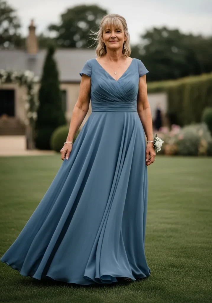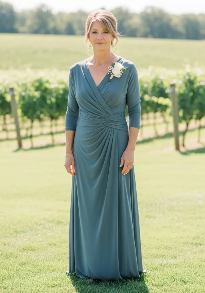 I adore how effortlessly elegant this dress feels. The wrap silhouette is so forgiving and comfortable, and the dusty blue shade feels classic and calming. It is perfect for vineyard weddings and outdoor celebrations where comfort and polish matter equally.