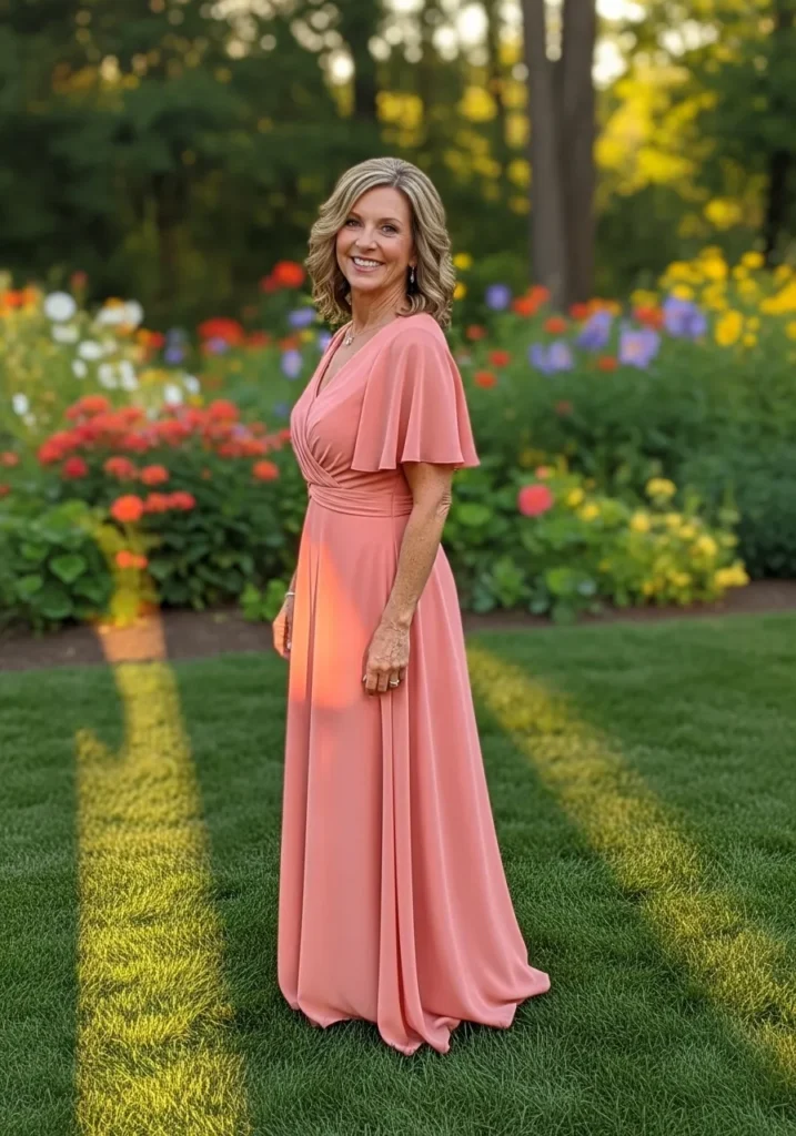 This coral gown features soft flutter sleeves, a gently cinched waist, and a flowing skirt that drapes beautifully over the body. The lightweight fabric moves easily, creating a relaxed and airy silhouette that feels perfect for warm spring celebrations. The vibrant garden setting enhances the cheerful tone of the dress and highlights its fresh, romantic feel.