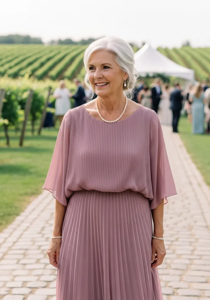 This mauve pleated dress features a loose, airy silhouette with gentle waist definition and flowing fabric. The soft pleats add texture and movement, while the relaxed sleeves create an effortless and comfortable feel. The vineyard setting enhances the romantic charm and natural beauty of the look.