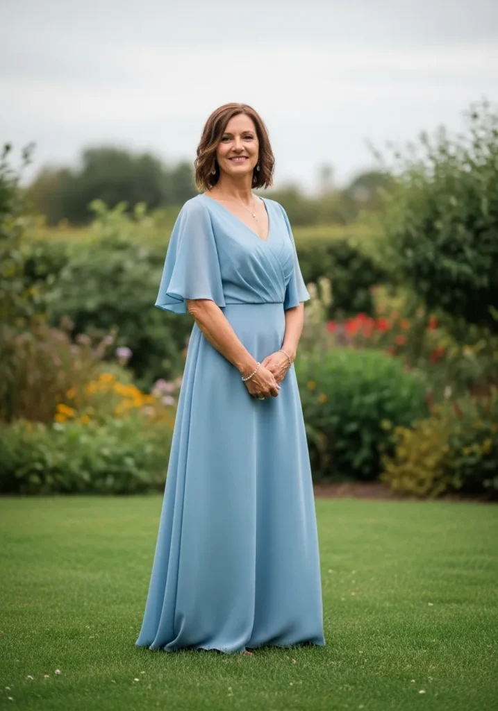 This dusty blue gown showcases a timeless A line silhouette with gentle pleating and a softly draped bodice. The lightweight fabric creates natural movement, while the flowing skirt offers both comfort and elegance. The manicured garden backdrop enhances the polished look and gives the entire scene a fresh, romantic feel.