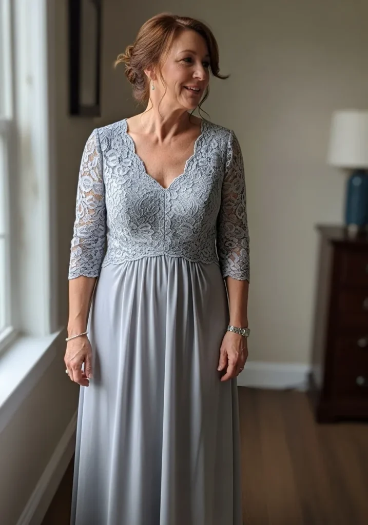 I love how timeless and sophisticated this dress feels. The lace adds polish, but the chiffon keeps everything soft and wearable. It is a wonderful option for anyone who wants classic elegance without sacrificing comfort.