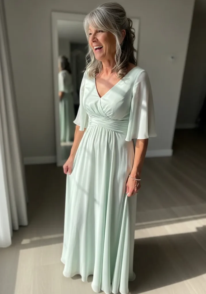 This soft mint gown features a flattering wrap bodice, flutter sleeves, and a flowing skirt that drapes effortlessly. The lightweight fabric catches the natural window light beautifully, highlighting the gentle folds and movement of the dress. The relaxed silhouette creates a graceful shape that feels comfortable, breathable, and easy to wear.