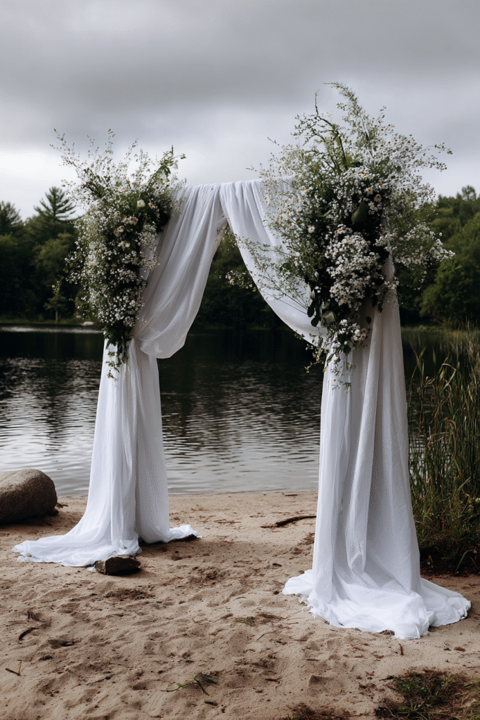 This arch is set right on a sandy lakeshore with soft white fabric draped loosely from a simple wooden frame. Airy baby’s breath and wild greenery climb up both sides and spill gently over the top, creating an organic and slightly untamed look. The white florals pop beautifully against the calm water and tree lined background, while the fabric pools softly at the base for a relaxed and romantic finish.