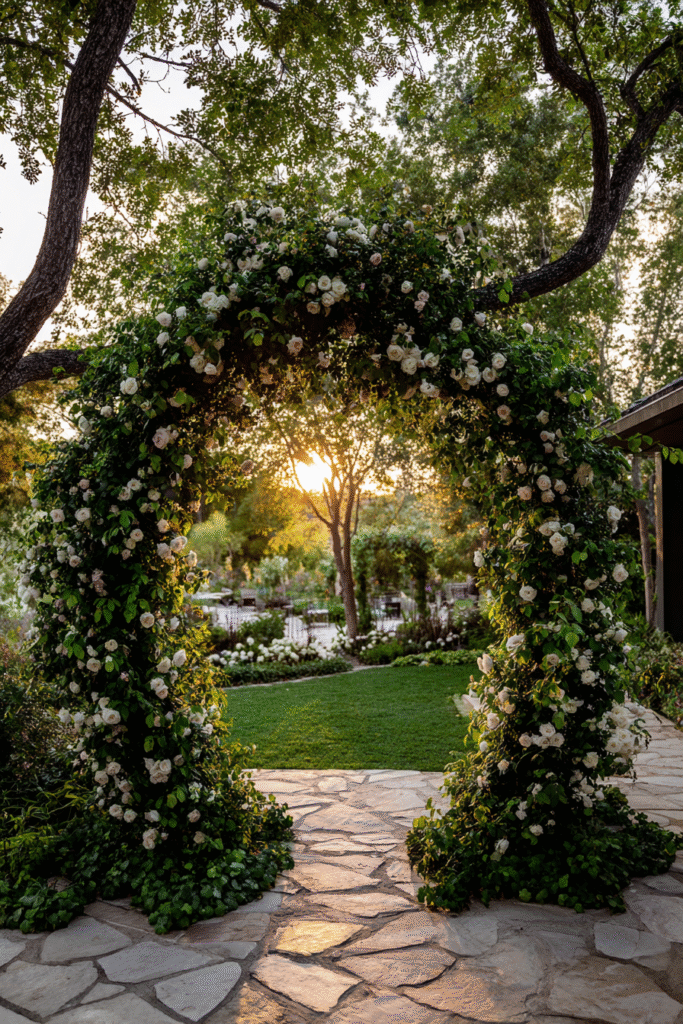 This arch is completely wrapped in rich green foliage and soft white roses, forming a full rounded shape that feels straight out of a secret garden. Ivy and climbing greenery cascade down both sides while creamy blooms are tucked throughout for a layered and natural look. Set along a stone path with trees overhead and golden light filtering through, the arch feels grounded and elegant without looking overly styled.
