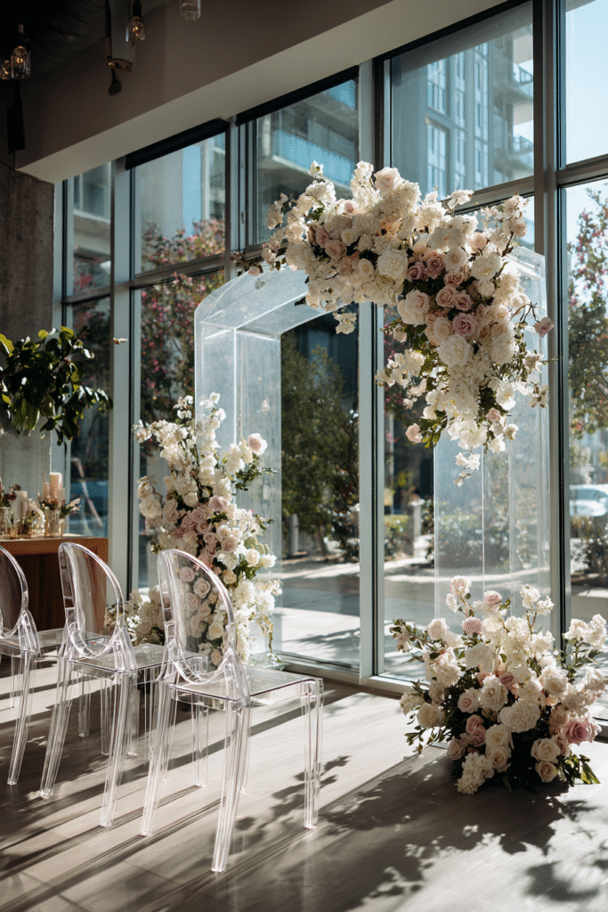 This arch uses a transparent acrylic frame that almost disappears into the space, letting the flowers take center stage. Soft blush roses, creamy white blooms, and delicate spring florals cascade asymmetrically along the sides and top, with matching arrangements placed at the base. Set inside a light filled modern venue with floor to ceiling windows and clear chairs, the whole setup feels airy, polished, and beautifully balanced.