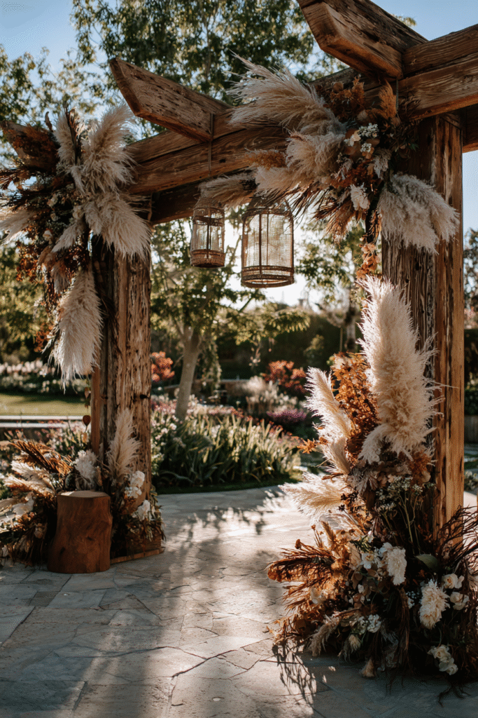This arch is built from thick weathered wood beams and decorated with flowing pampas grass, dried florals, and warm neutral textures. Soft beige plumes mix with muted browns and creamy accents, creating a layered and natural look that feels grounded and earthy. Hanging woven lanterns add a cozy touch, while the garden setting and afternoon light make everything feel warm and inviting.