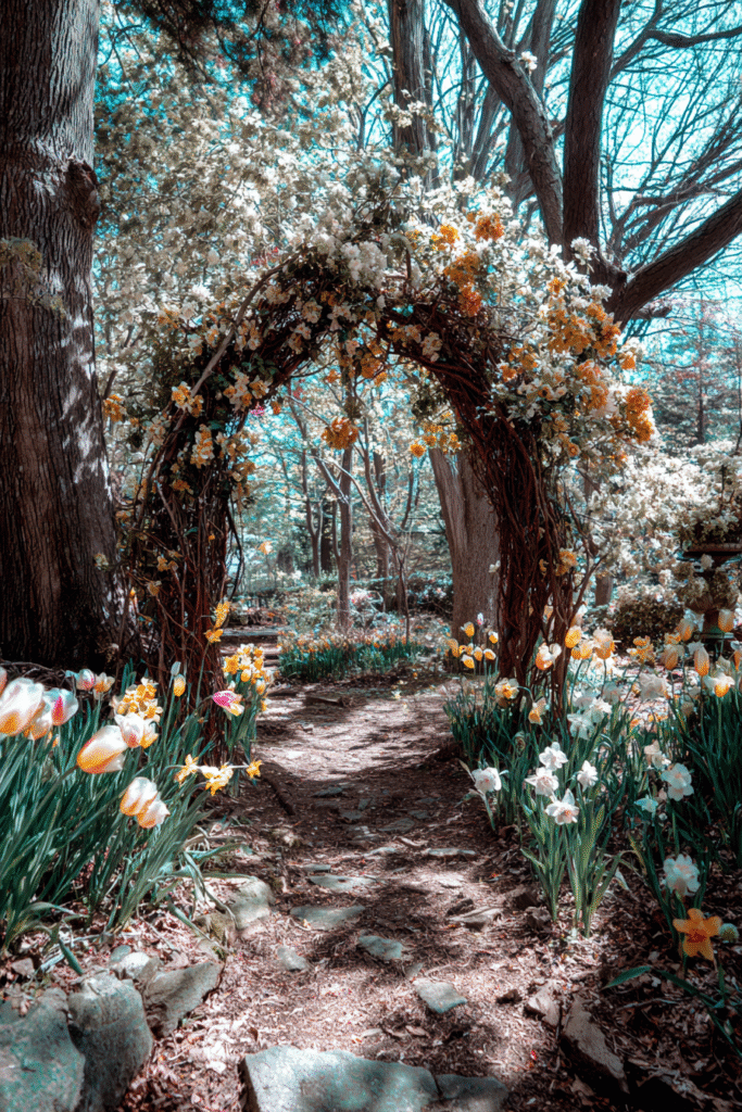 This arch is formed from natural branches woven together and wrapped with soft spring blossoms in creamy white and warm golden tones. Delicate flowers trail along the curve while fresh greenery peeks through, making it feel like part of the forest itself. Set along a stone path and surrounded by blooming tulips and tall trees, the whole scene feels tucked away and quietly magical.