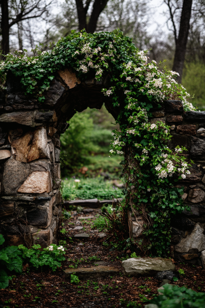 This arch is built from weathered stone and completely softened by trailing ivy and tiny white spring blossoms. The greenery spills naturally over the curved opening, with delicate flowers tucked throughout for a quiet pop of texture. A simple garden path leads through the arch, surrounded by mossy stones and fresh foliage that make the whole scene feel calm and timeless.