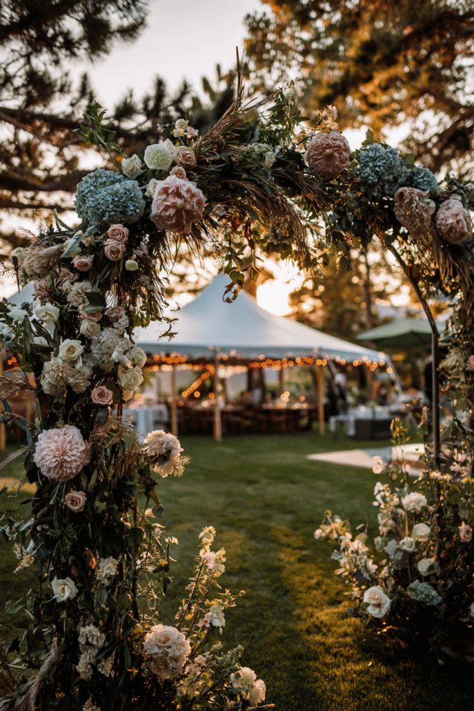 This arch is fully dressed in soft spring florals and flowing greenery, creating a lush frame that opens onto a glowing outdoor reception space. Blush roses, pale blue hydrangeas, creamy blooms, and textured foliage are layered generously along the curve, with delicate stems reaching outward for a natural feel. Set on a green lawn with a tented reception and warm lights in the background, the arch feels perfectly placed for a golden hour ceremony.