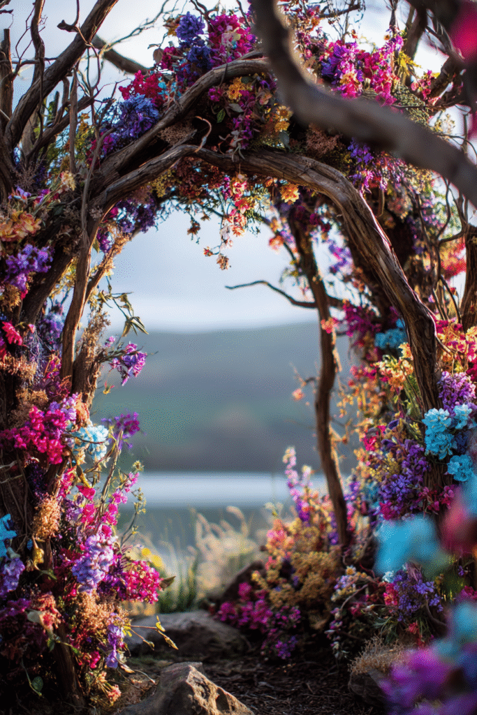 This arch is made from twisting natural branches wrapped in vibrant wildflowers that feel bold and untamed. Rich purples, bright pinks, pops of blue, and warm golden blooms are layered densely along the curved shape, with petals and greenery spilling outward in every direction. Set against an open landscape with soft hills in the distance, the colors feel extra alive and full of movement.