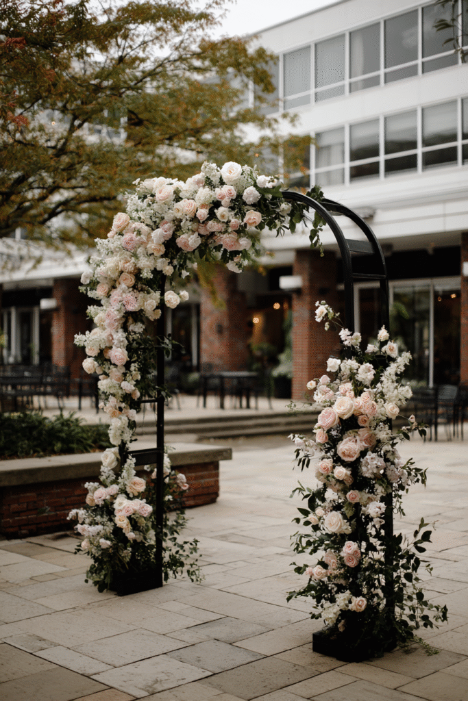 This arch features a sleek black metal frame softened with cascading blush roses, creamy white blooms, and fresh greenery. Florals are arranged asymmetrically along the curve and base, creating a balanced look that feels airy and intentional. Set in a clean courtyard with brick accents and modern architecture, the soft florals really stand out against the structured backdrop.