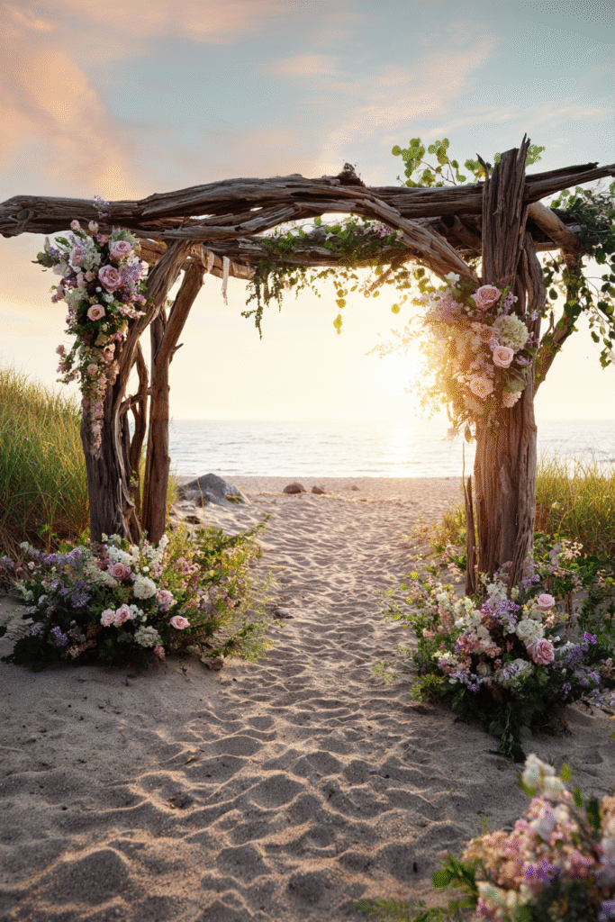 I love how effortless this design feels. The mix of natural wood and delicate florals gives it that barefoot elegance that works so beautifully for a spring beach ceremony. If you are dreaming of something simple but still meaningful, this arch feels warm, peaceful, and incredibly photogenic at sunset.