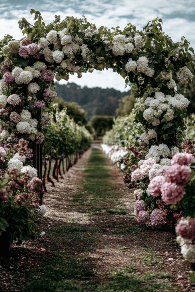 This arch is overflowing with lush hydrangeas in soft white and blush tones, woven tightly with green vines and leaves. The rounded shape frames a long vineyard path, with rows of vines stretching out behind it for a perfectly balanced and romantic scene. The flowers feel full and cloud like, creating a statement entrance that blends beautifully into the natural vineyard setting.
