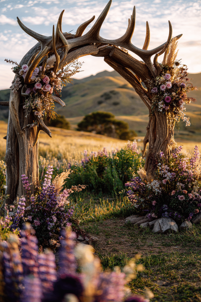 This arch is crafted from weathered wood and sculptural antler shapes that curve naturally overhead, creating a bold and organic frame. Soft spring florals in blush, lavender, and creamy white are tucked into the sides and base, with wildflowers growing freely around the structure. Set in an open meadow with rolling hills in the distance, the arch feels grounded in nature and beautifully dramatic.