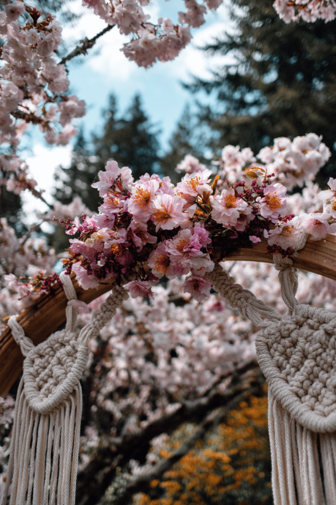 This arch features soft pink cherry blossoms woven along a natural wooden beam, paired with hand knotted macrame panels hanging gracefully on each side. The blossoms feel light and airy, with layered petals and warm centers that add beautiful texture up close. Set beneath blooming trees and open sky, the mix of florals and fiber gives the arch a relaxed spring look with a touch of boho charm.