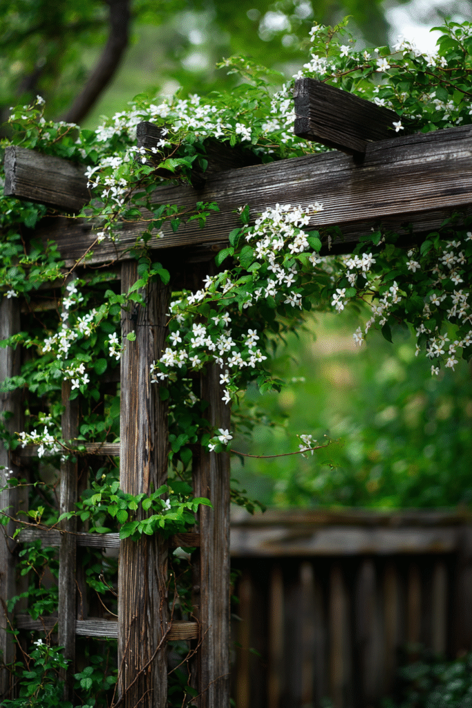 This arch features a rustic wooden trellis covered in delicate white blossoms and fresh green vines. Tiny flowers trail naturally across the weathered wood, creating a soft layered look that feels light and organic. The simple structure blends into the garden setting beautifully, letting the greenery and blooms feel like they are growing right into place.